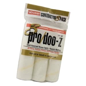 Product Description : From the ManufacturerWooster builds the ultimate performance standards into Pro/Doo-Z. The dense, high-capacity fabric has interlocked fibers to prevent shedding. No other roller produces a smoother finish. It features the same top-quality white fabric with the golden pinstripe as the day it was introduced. Pro/Doo-Z provides excellent results with the most demanding coatings: industrial enamels, epoxy floor finishes, moisture-cure or catalyzed urethanes. The coverage is flawless with all common paints and finishes. Pro/Doo-Z resists matting and stays resilient through a full day of use. The Wooster Brush Company has been manufacturing innovative, high-performance painting tools right out of Wooster, Ohio USA since 1851. Our trade names include Ultra/Pro, Advantage, Yachtsman, Shortcut paintbrushes; Super/Fab, Super Doo-Z roller covers; Sherlock frames and extension poles; Jumbo-Koter minirollers; and Prep Crew surface prep tools. You can feel confident knowing Wooster is the name behind your painting tools. Product Description : RR723-9 Features: -Shed-resistant for all paints, urethanes, industrial enamels, and epoxies.-Green Sherlock copolymer core resists solvents and stops delaminating.-Fits frame (3651-1996).-3/8'' nap.-3 per card. Color/Finish: -Proprietary high-density white fabric with golden pinstripe stays resilient, resists matting for the smoothest professional finish.