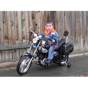 Product Description : Electric Kids Ride on Motorcycle with saddle bags and key ignition. This is the most popular style of this bike and holds up to 90 lbs. This is our most popular of all bikes we sell. The tank is painted silver on the blue tank. The saddlebags are made so you can use them. The key ignition starts the bike with an engine rumble. The hand throttle makes the bike go. It can go about 4-6 mph. This is a great bike for kids. Looks like a real Harley. Comes with rechargeable battery, Charger and training wheels 6 volt battery Saddle bags Key ignition Engine Rumble sounds Metal tube frame Supports up to 90 lbs. Aproximate speed is 4-6 mph. Comes with battery , Charger and training wheels. Perfect for kids 3-7 years old.