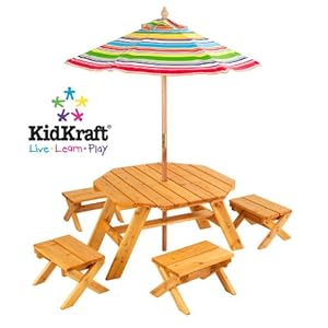 Product Description : The Kidkraft Kids Table and Chair Set with Multi Striped Umbrella is perfect for snack time, craft time, dinner time, and more! Constructed of durable Sanmu wood, the child-sized octagon table and benches are weather-resistant for years of use! The sturdy construction makes it a perfect choice for families with multiple children. The bright, multi-colored striped canvas umbrella protects your kids from harsh UV rays, so they can safely enjoy the warm outdoor weather!
