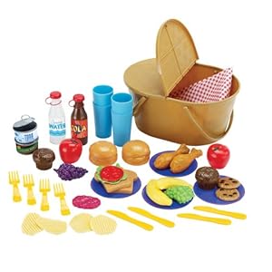 Product Description : From the ManufacturerPicnic set includes 4 plates, 4 cups, 4 forks and knives, 2 bananas, bottle of water, bottle of soda, 2 burgers, 2 apples, 2 chicken legs, 2 cans of food, 2 muffins, 2 cookies, 2 bunches of grapes, 2 slices of bread, lettuce, tomato, and jam. Product Description : The Picture Perfect Picnic Play Set is a 45 piece set and includes 4 plates, 4 cups, 4 forks, 4 knives, 2 bananas, bottle of water, 2 burgers, 2 apples, 2 chicken legs, 2 cans of food, 2 muffins, 2 cookies, 2 bunches of grapes. 2 slices of bread, lettuce, tomato and jam. Basket measures 10.75"L x 8"W x 5.25"H.