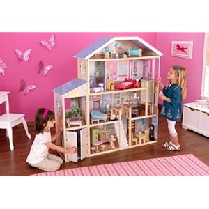Product Description : Majestic Mansion is over four feet wide and four-and-a-half feet tall, giving young girls tons of space for taking care of their favorite dolls. Includes 35 furniture pieces and accessories, including a grandfather clock, a cute little kitten and more. 8 rooms of open space to decorate. Elevator glides back and forth between the second floor and the third floor. Garage with doors that swing open and closed. Accommodates fashion dolls up to 12" tall. Large enough that multiple children can play at once. Made of composite wood products.