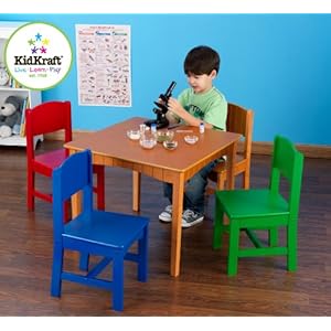 Product Description : From the ManufacturerOur wood Nantucket Honey Table and 4 Chair Set is a great place for coloring, board games, and crafts. With clean, simple lines, the set includes: Product Description : Our wood Nantucket Honey Table and 4 Chair Set is a great place for coloring, board games, and crafts. With clean, simple lines, the set includes: 1 honey-colored table with wainscoting detail. 4 chairs finished in blue, red, honey, and green. Dimensions Table: 23.75" x 23.75"x 19.75"H Chair: 23.25"H (seat 11"h)