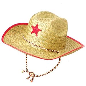 Product Description : Kids love to play dress-up and birthday party with a wild west or country theme is always fun! Give a cowboy hat to each child to wear and turn several upside down and fill them with candy or small toys for easy table centerpieces. Each straw cowboy hat has a red or blue plastic star and a chin cord. 22".Child sized ages 3-10Made of sturdy woven strawTie on chin strap2-PACK- 1 pounds